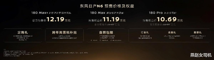 本次预售,东风日产N6推出180 Pro、180 Max、180 Max+三个版本。起步即高配,N6全系标配:20度以上大电池、180公里纯电长续航。