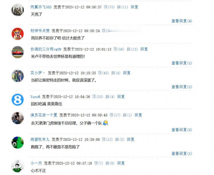 对于李明离职的报道,球迷在评论区选择了清一色的嘲讽。有球迷表示:“当初让施密特走的时候,就应该滚蛋了。”还有球迷说:”周总养不起你了吧? 估计太能贪了。“也有球迷表示”:“跑路了,再不撤是不是危险了”。也许,群众的眼睛是雪亮的。