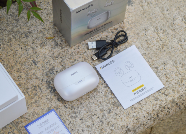 南卡Clip Super2耳夹式开放蓝牙耳机的包装设计十分简约,内含c口连接线、说明书以及质保凭证。充电仓采用了拼接设计,细腻触感的ABS材质搭配下半手持部分光面外观较为新颖别致。造型圆润正面方便单手开合,且配有状态指示灯。充电仓体积可单手握持,外带揣兜也比较方便。