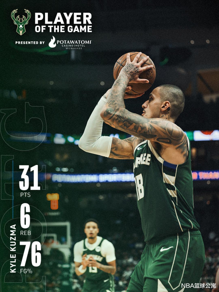 库兹马此战的得分创下雄鹿生涯新高,他打出了密尔沃基生涯的最强一战。库兹马上半场砍下了18分,次节独得14分率队紧咬比分。下半场,库兹马再得13分。第3节,库兹马狂轰11分,率队打出了27比13的单节比分,就此锁定大局。