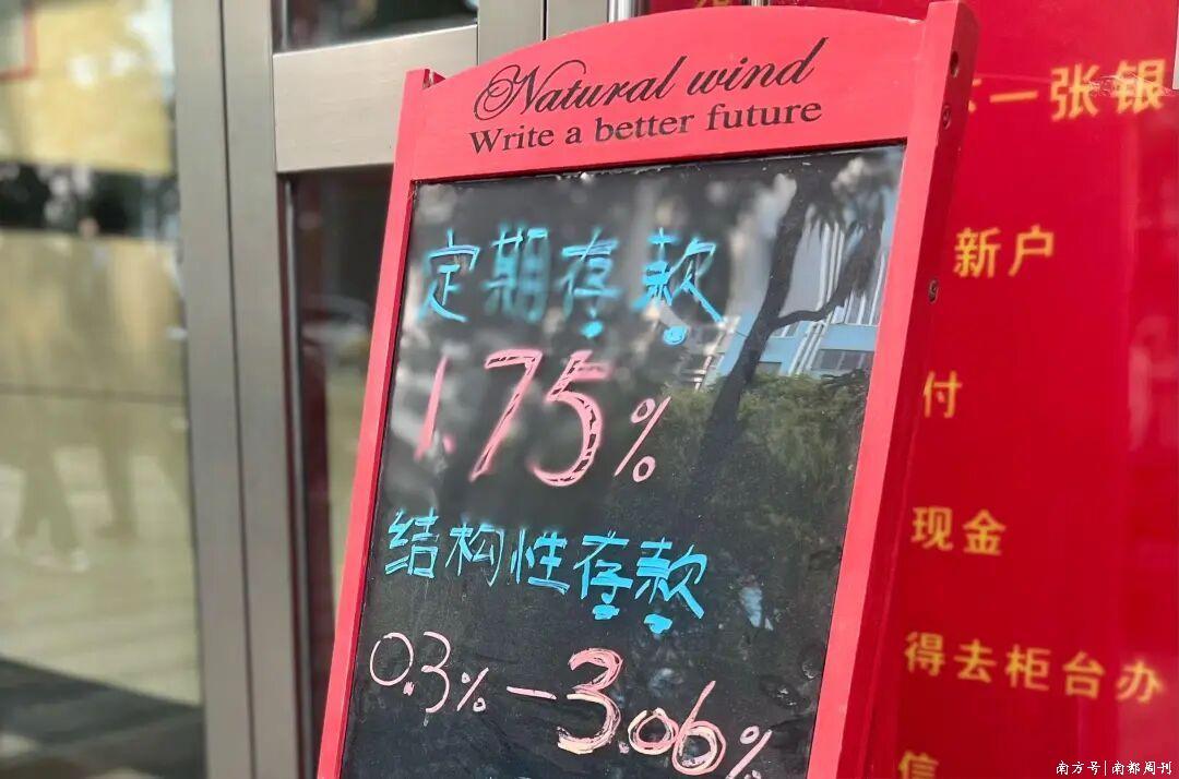 1月19日,南都湾财社记者在一股份行五羊世纪云顶社区支行看到,该行宣传黑板上写着“结构性存款 0.3%-3.06%”字样。
