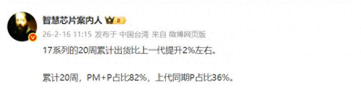 来自行业人士“智慧芯片案内人”的数据显示,小米17系列发售20周,累计出货量比上一代小米15系列提升2%左右。且在这20周的销量中,小米17 Pro Max+小米17 Pro的占比高达82%,要知道上一代小米15 Pro的占比才36%。定位更高且售价更高的小米17 Pro系列销量更好,这才是小米17系列与小米15系列本质上最大的区别所在。因为小米15系列是以标准版为基本盘的,而小米17系列却是以售价最高的小米17 Pro Max为基本盘,在平均售价比上一代高出近2000元的前提之下,销量同比还提升了,这才是小米17系列的关键所在。