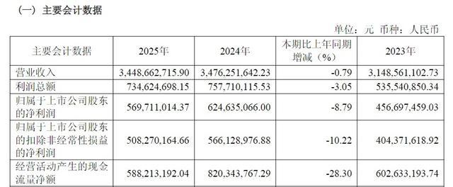 天味食品日前发布的2025年年报显示,公司全年实现营业收入34.48亿元,同比下降0.79%;实现归属于上市公司股东的净利润5.69亿元,同比下降8.79%;实现扣非归母净利润5.08亿元,同比下滑10.22%;基本每股收益0.5386元,同比下滑9.11%。分红方面,天味食品拟向全体股东每股派发现金红利0.55元(含税)。
