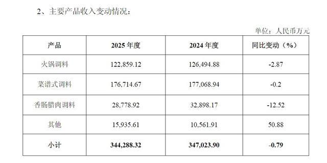 渠道方面,从天味食品披露的情况来看,线下渠道一直是公司的收入主心骨,然而在2025年,该渠道的销售收入同比下滑了12.76%,其传统经销渠道的销售阻力有所增大。