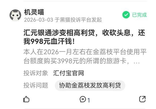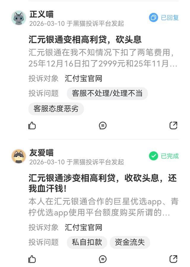 此外,汇元银通还频遭消费者投诉,密集指向其收砍头息、变相高利贷以及违规乱扣费、收取高额权益费等问题。投诉对象均为汇付宝官网,而收款方汇付宝正是汇元银通旗下的支付品牌。
