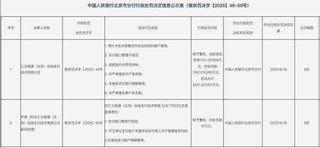 2025年6月20日,汇元银通因涉及“预付卡在未签署合作协议的特约商户使用、支付接口管理不规范、违规进行非同名划转、未严格落实开户实名制、未落实支付账户限额管理、未严格落实商户实名制”等六项违法行为类型,被中国人民银行北京市分行罚没2431.42万元。同时,时任汇元银通副总经理尹某对部分违法行为负有直接责任,被警告并处罚款15万元。